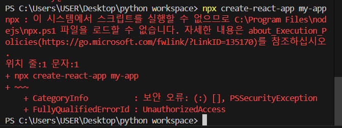 - Terminal 에서 create-react-app 오류 (보안오류 PSSecurityexception)