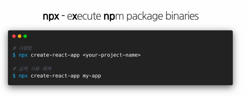 npx : npm 패키지를 설치한 이후에 실행까지 해주는 명령어. 패키지를 정해진 위치에 설치하고 실행하면 번거롭기 때문에