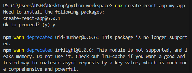 다시 vs code에서 terminal에 'npx create-react-app <하고싶은 프로젝트 네임>'을 실행한다