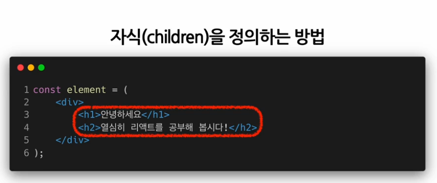 3) 자식(children)정의하는 방법: html처럼 상위 태그가 하위태그를 둘러싸도록 함.