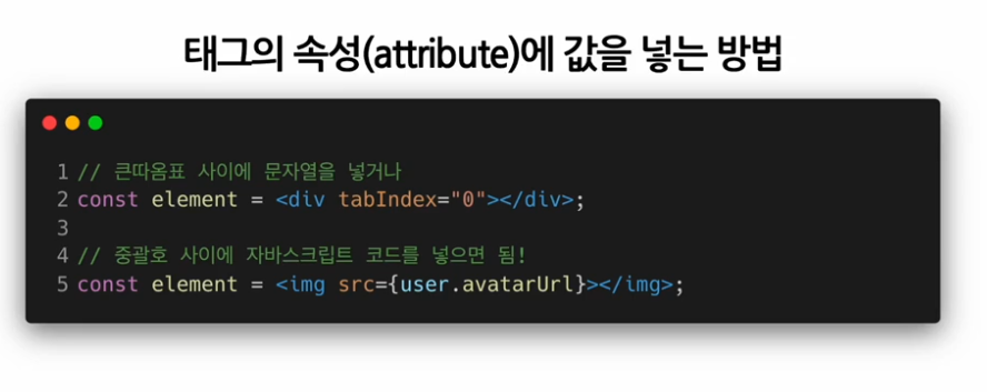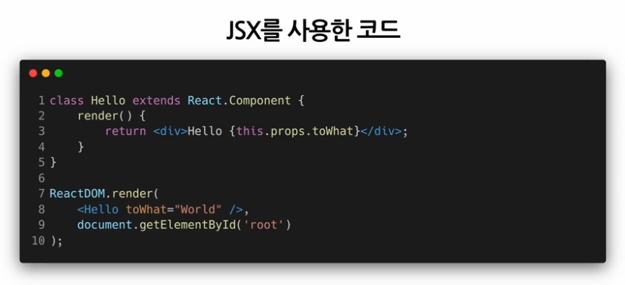 - jsx는 html의 <h1>,</h1>을 사용하고 있음.