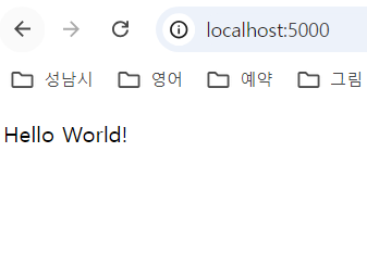http://localhost:5000/ 를 입력하여 들어가면 hello world!라고 출력되는 것을 확인할 수 있다.