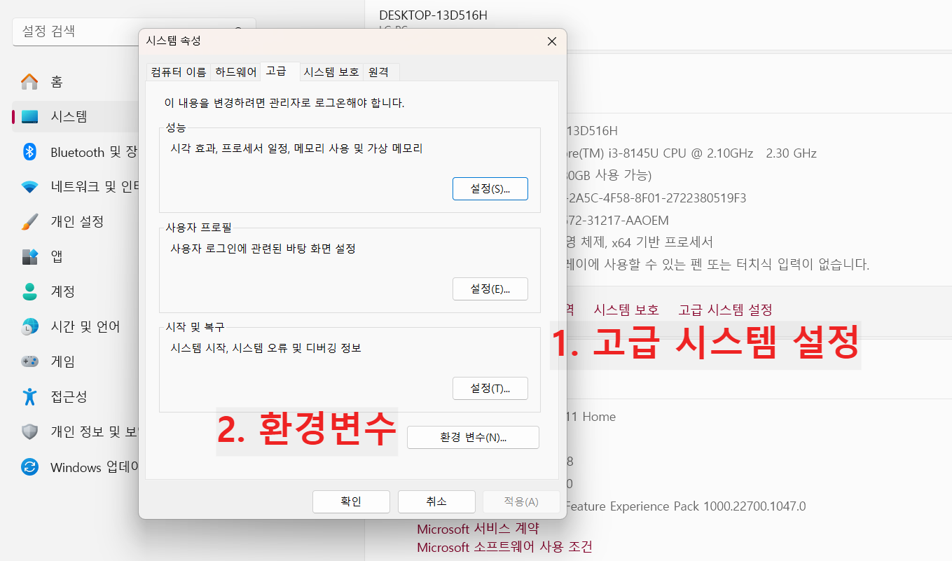1. 제어판 -> 시스템 -> 고급 시스템 설정-> 환경 변수
