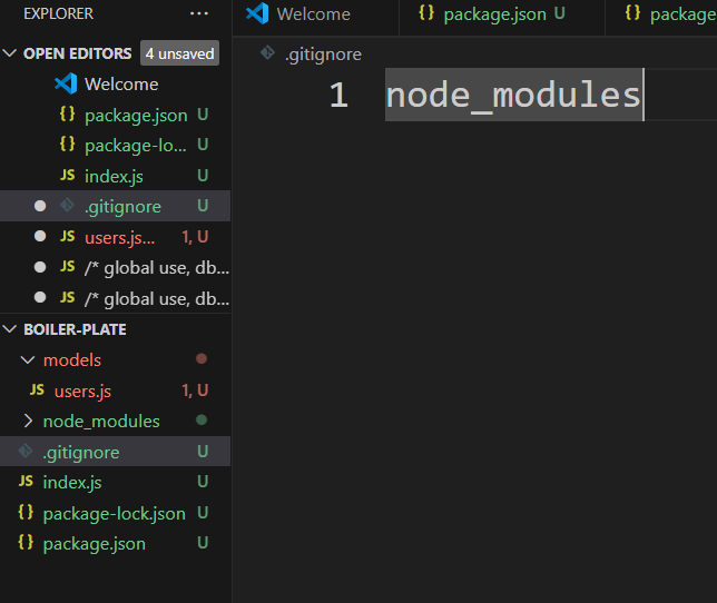 ex1) .gitignore 파일 만들고 안에 node_modules 입력하면 node 폴더는 안올라감. (너무 사사로운게 많음)