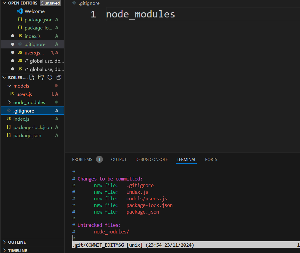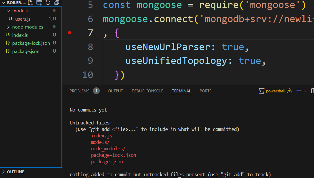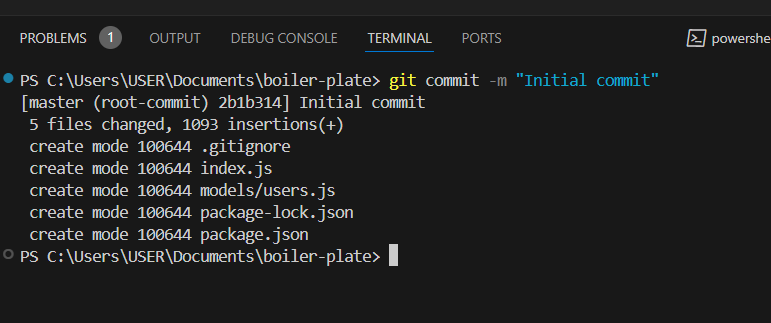 1번) git 저장소를 만들어야하므로 루트 디렉토리 파일(index.js)에 terminal 키고 git init 입력