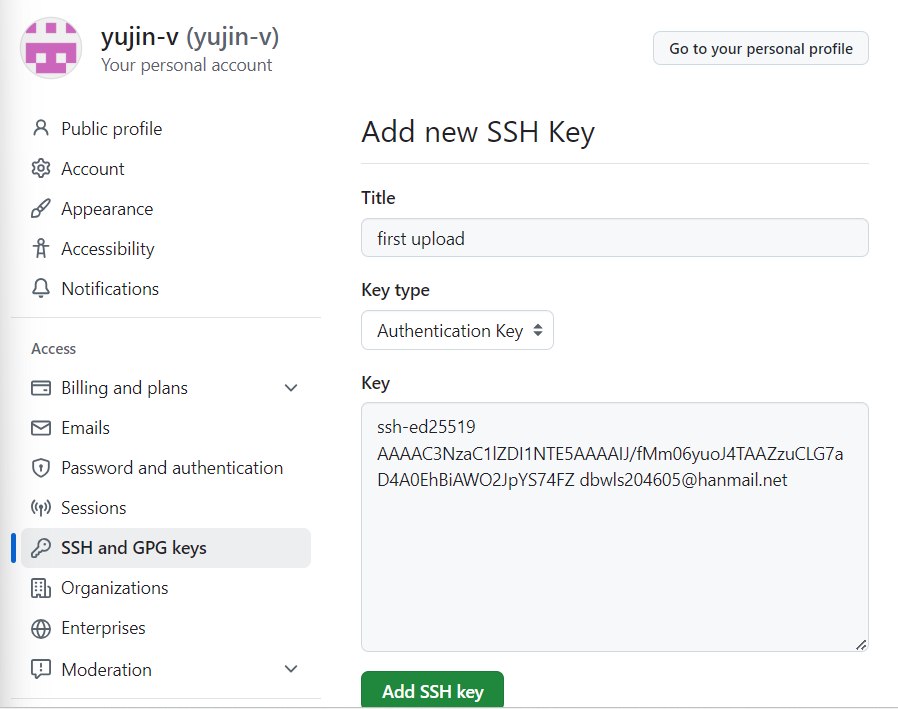 10. 퍼블릭을 추가한다 (cat ~/.ssh/id_ed25519.pub)