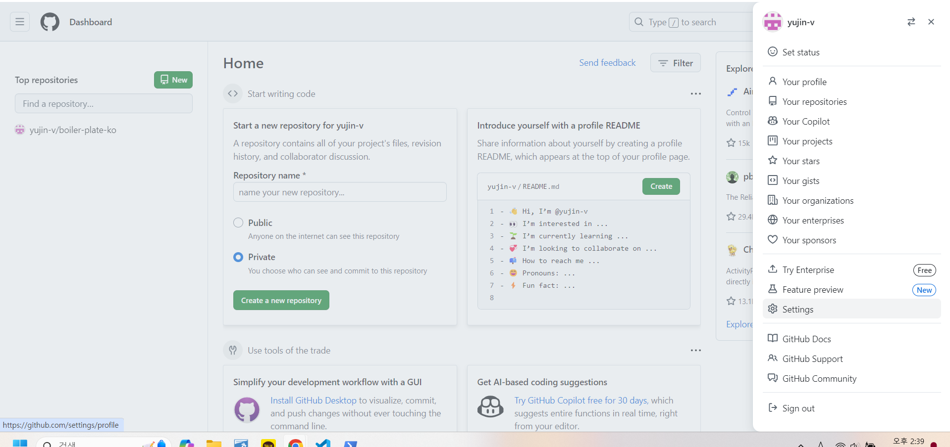 드.디.어 내 컴퓨터와 github서버 통신이 완벽한 상태가 됨! git hub 의 repositories에 있는 코드 옮길 수 있다!