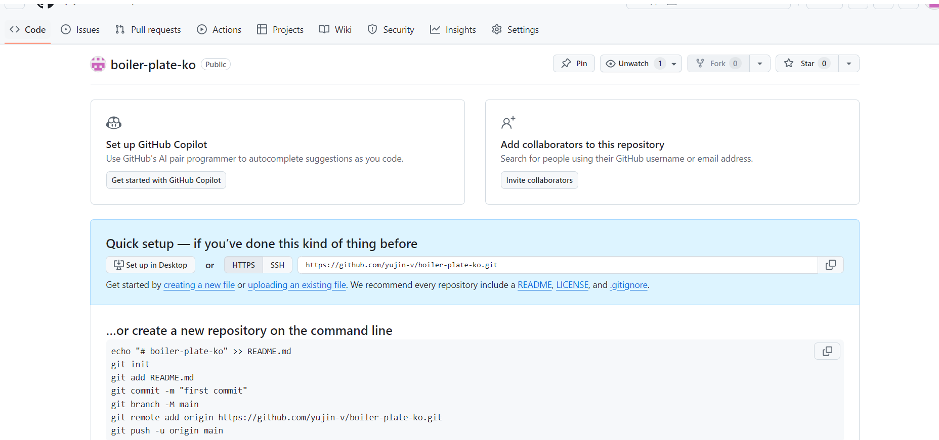 1. repositories에 가서 맨 첫 번째 줄만 긁어옴(git init, git commit은 이미 해놨어서)