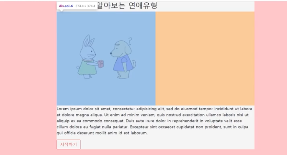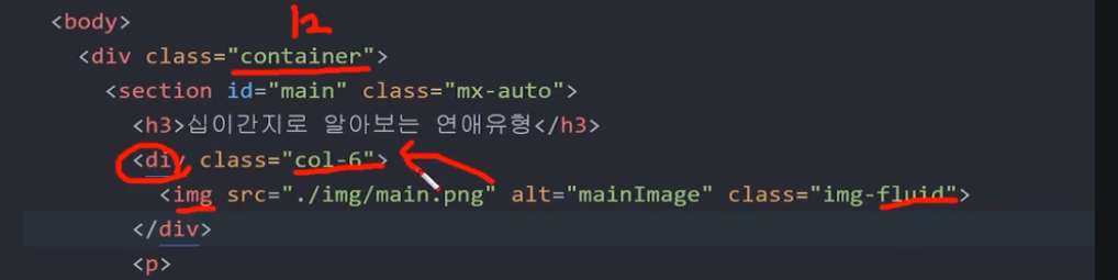 container는 12등분이고, img 위에 div.col-6을 입력해서 div태그로 img 감싼다.