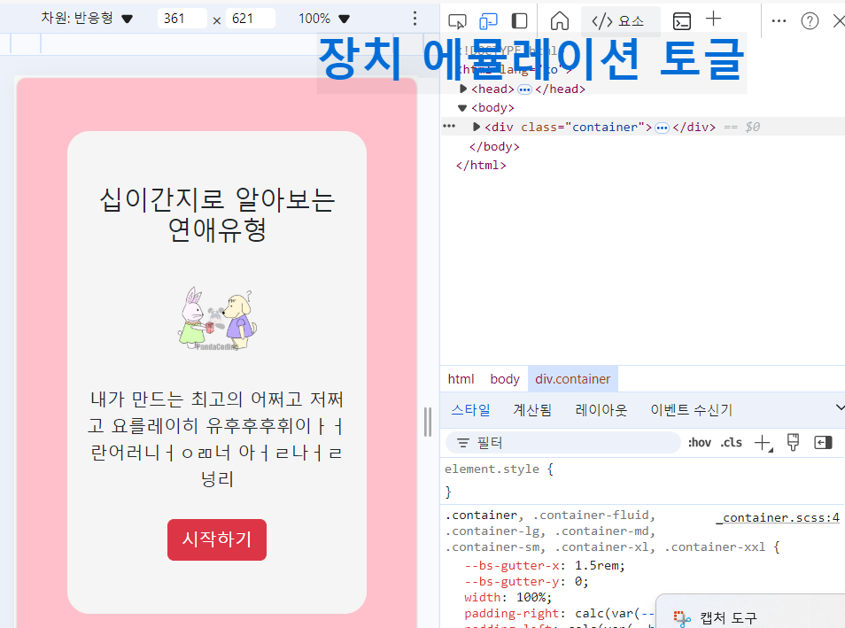 - 마우스 오른쪽 버튼 -> 검사-> 장치 에뮬레이션 토글 (ctrl+Shift+m)