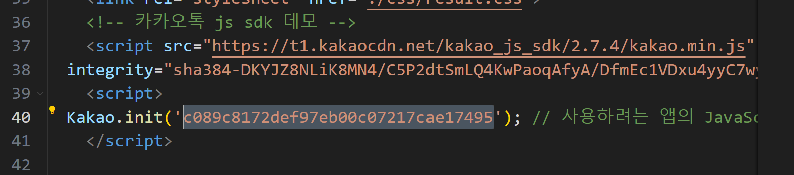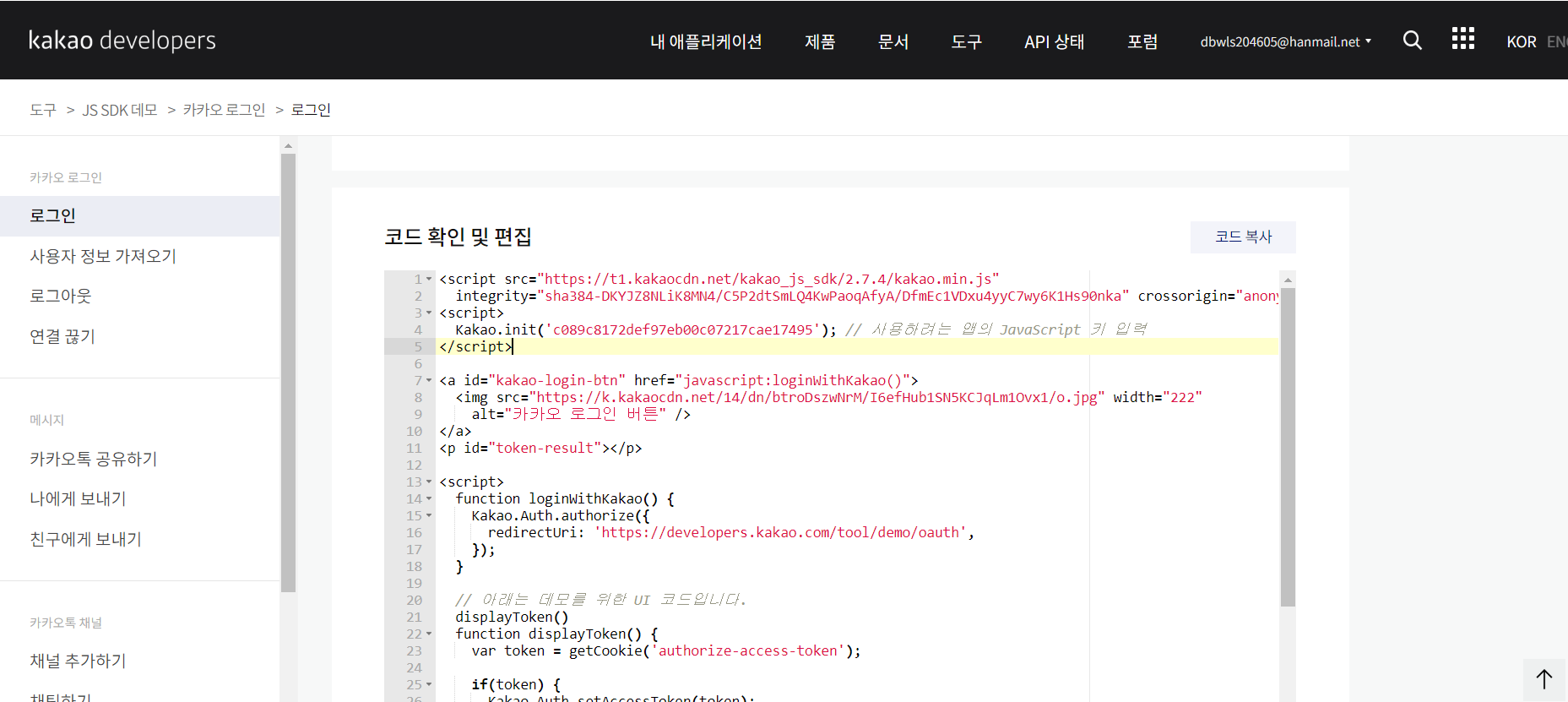 7. script src와 초기화를 위한 script kakao.init 코드( 1~5번째 줄)을 복사해