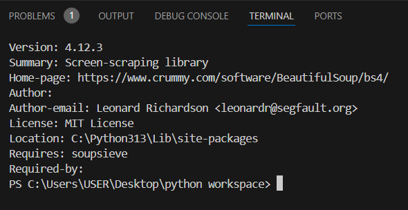 5. 파이썬 다운로드 받은 패키지 정보 보는 방법: pip show beautifulsoup4 입력하면 버전,홈페이지, 라이센스, 저장된 위치 등을 볼 수 있음.